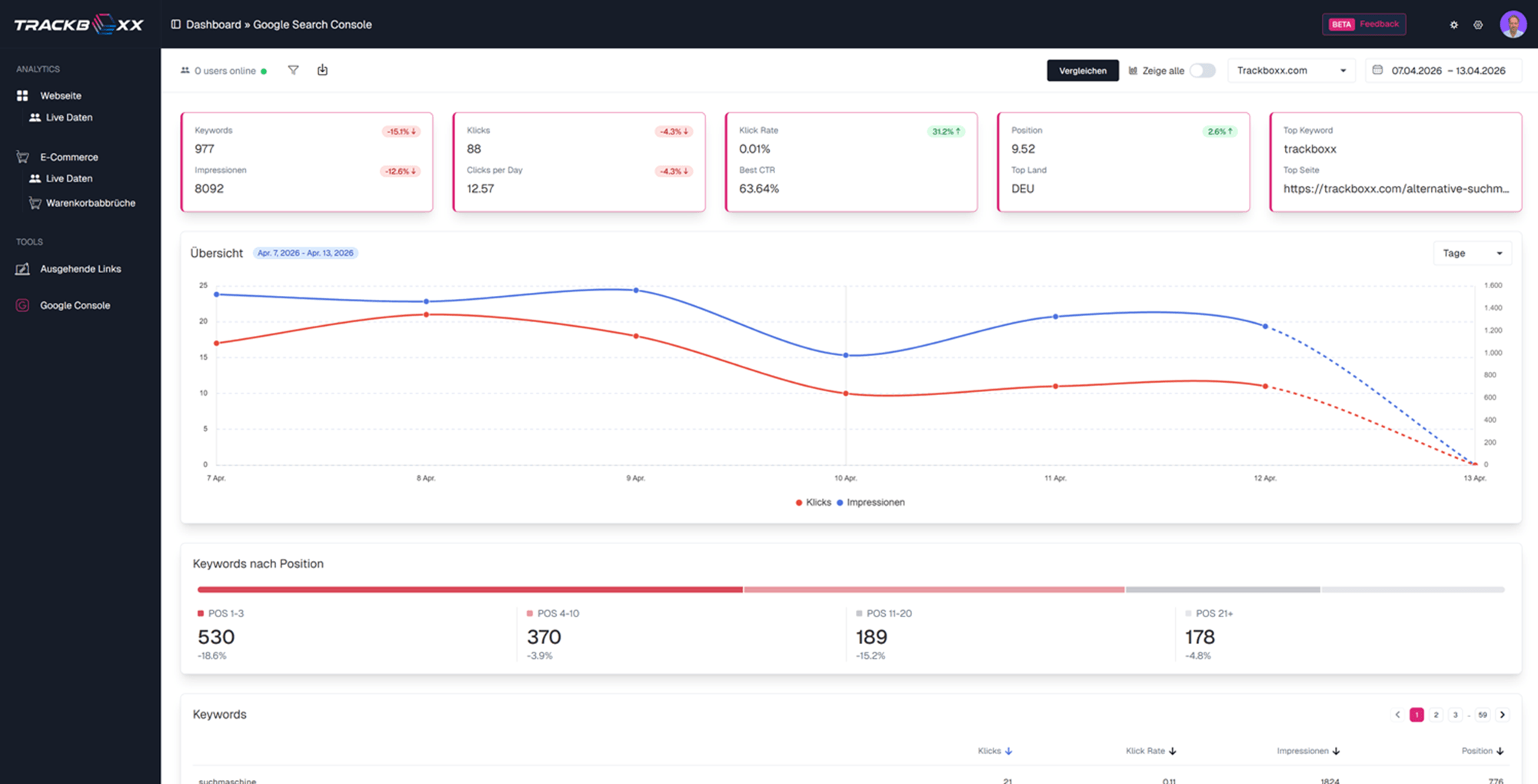 In Deinem persönlichen Trackboxx Dashboard kannst Du nachvollziehen, welche Endgeräte und Browser Deine Webseitenbesucher nutzen. Diese Information hilft Dir dabei, Inhalte entsprechend zu optimieren – insbesondere dann, wenn Du die Daten mit anderen Werten wie beispielsweise der Absprungrate verknüpfst.